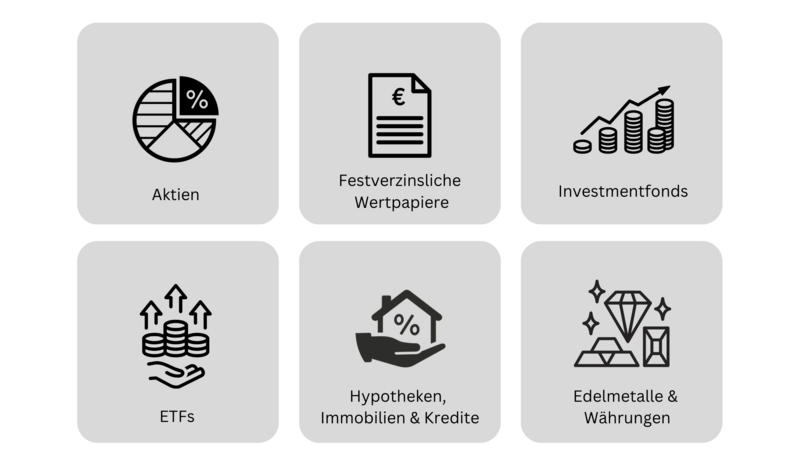 Die Auswahl von passenden Finanzinstrumenten ist ein wichtiger Schritt bei der Umsetzung einer Anlagestrategie. Dabei müssen individuelle Präferenzen und Ziele, aber auch das Risikoprofil berücksichtigt werden. Finanzinstrumente können verschiedene Formen annehmen, wie Aktien, Anleihen bzw. festverzinsliche Wertpapiere, Investmentfonds und ETFs ("Exchange-Traded-Funds") oder auch Derivate. Die Auswahl des passenden Instruments basiert auf einer fundierten Analyse der Marktsituation und des jeweiligen Finanzprodukts.